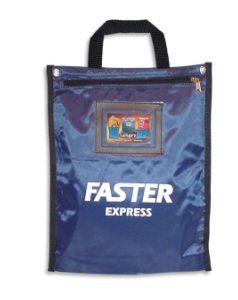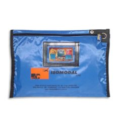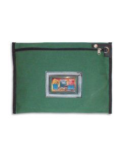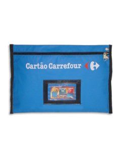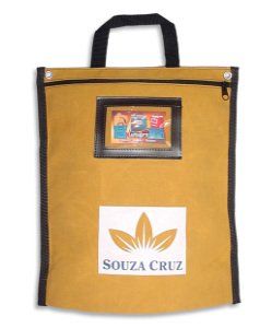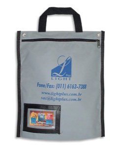 Pasta em lona com visor, zíper, terminal de couro e argola com ilhós para lacrar.