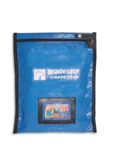 Pasta em nylon com visor, zíper, terminal de couro e argola com ilhós para lacrar.